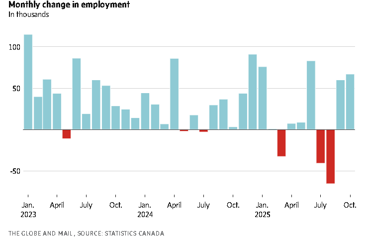 The Canadian economy enjoyed a burst of hiring activity for the second consecutive month in October, offsetting summer job losses and bolstering calls that the Bank of Canada is done cutting interest rates for now.