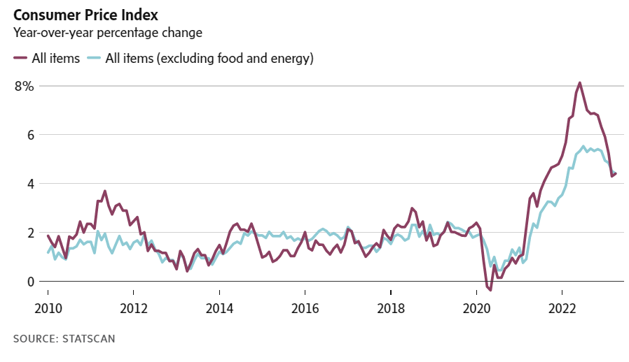 Canada’s annual inflation rate ticked up to 4.4% in April, as higher shelter costs contributed to the first acceleration in the consumer price index in 11 months. The reading surprised the Street, which was looking for a rise of 4.1%.