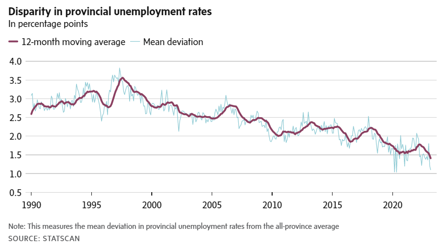 Over more than two decades, the disparities between provincial unemployment rates have been shrinking, and now those differences are especially small. Despite having very different economies, Alberta and Nova Scotia enjoy jobless rates of 5.7 per cent. Quebec boasts the lowest, 4.2 per cent, although B.C. isn’t far behind at 4.5 per cent.