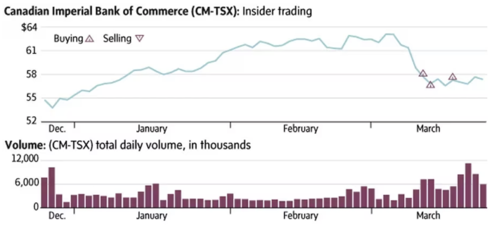 As of March 20, five of the six big Canadian banks had seen net insider accumulation over the past month through either public market buying or derivative exercises. The one exception is Royal Bank of Canada, which has flat insider holdings. Today, we highlight Canadian Imperial Bank of Commerce CM-T -0.11%decrease, which has buying and no selling over the past month. During the period, three insiders spent a combined $5.169-million buying shares in the public market. President and CEO Victor Dodig was the biggest buyer, acquiring 86,440 common shares at an average price of $57.91.