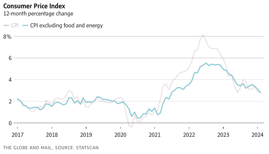 The Consumer Price Index rose 2.8 per cent in February on an annual basis, down from 2.9 per cent in January, Statistics Canada said Tuesday in a report. Analysts were expecting an upturn to 3.1 per cent. This was the second consecutive month that CPI growth has undershot estimates by a wide margin.
