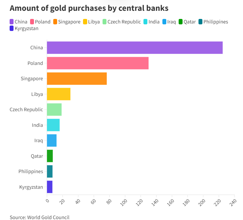 Poland’s central bank was the second-largest net consumer of gold, snapping up 130 tons of bullion in 2023.