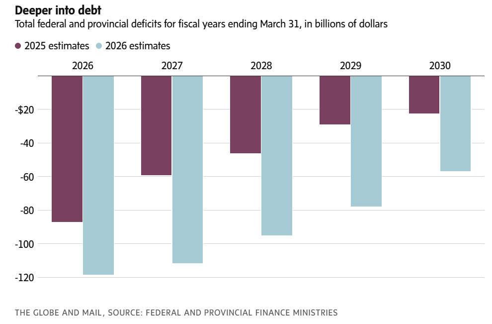 Now, those deficit projections are growing, quickly and dangerously. As the graphic below shows, the collective deficit of the federal and provincial governments projected for the fiscal year just started has risen by an eye-popping 88 per cent, or $52.3-billion compared to last year’s outlook.