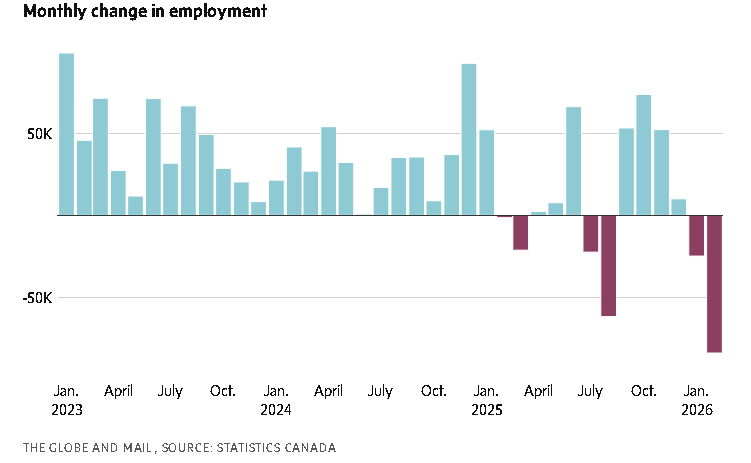 The February labour results were substantially worse than economists expected. Heading into Friday, analysts had predicted a gain of 10,000 positions, a partial bounce back from a decline of 25,000 in January.