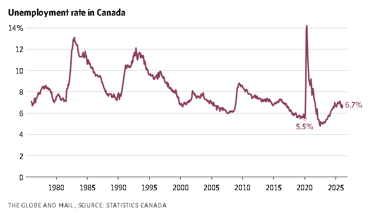 Youth unemployment also soared back to highs last seen in the fall of 2025. The unemployment rate among this group, ages 15 to 24, rose 1.3 percentage points in February to 14.1 per cent. In September, 2025, youth unemployment peaked at 14.6 per cent, a number that was the highest since 2010 excluding the pandemic years.