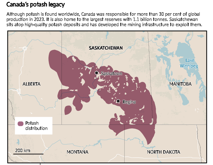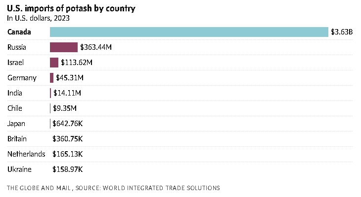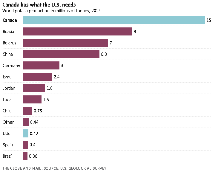 One Canadian company – Saskatchewan-based Nutrien Ltd. – is the largest global producer of potash. Potash is one of three fertilizers critical to all major agricultural operations and the U.S. depends on Canada for more than 80 per cent of its demand.