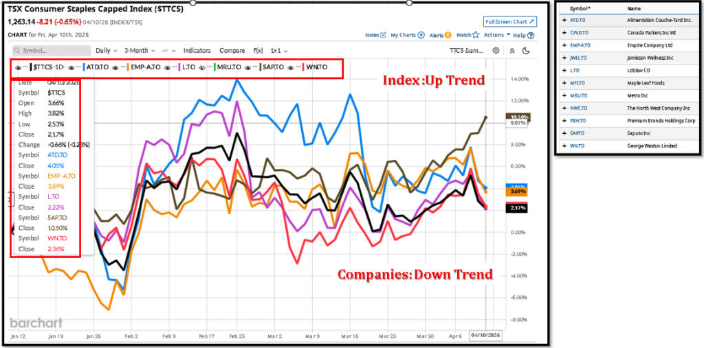 S&P/TSX Consumer Staples Index moving opposite companies in 3 month daily chart