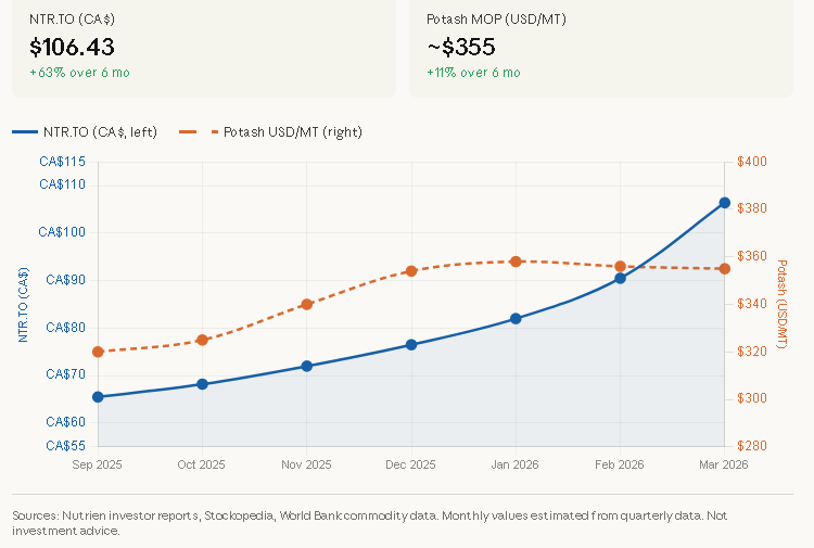 NTR.TO (solid blue, left axis) shows the sharp run-up from ~CA$65 to over $106, while potash MOP prices (dashed orange, right axis) climbed more modestly from ~$320 to ~$355/MT over the same period.